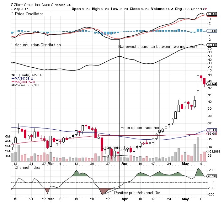 The long call option trade entry is where the vertical line starting from an upswing in Accumulation/Distribution